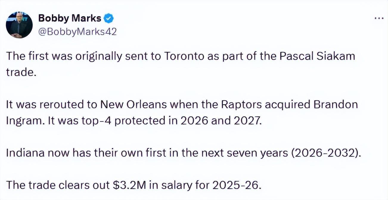 “步行者将今年的首轮23号签,以及2023年47号秀莫哈维-金的签约权打包,送至鹈鹕,换回一枚2026年首轮选秀权。”