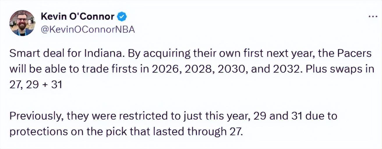 “步行者这笔交易看似平淡无奇,但意义重大。他们通过明智操作,为未来几年建立起资产储备。”